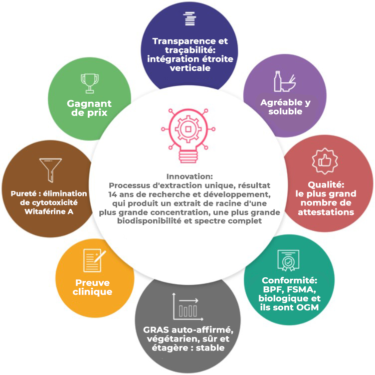 Gagnant du prix: Pour plusieurs des facteurs énumérés ci-dessus, le KSM-66 a reçu le prix de l’ingrédient de nutrition sportive de l’année de The NutraIngredients Asia 2018, a reçu le « SFE-Herbal Industry Leader Award » 2016, Frost & Sullivan 2014 « Product Innovation » en 2016. Botanicals », prix du « Meilleur ingrédient botanique » en 2013 à Natural Products Expo West et prix « Ingrédient innovant de l’année » en 2012 à Panacea